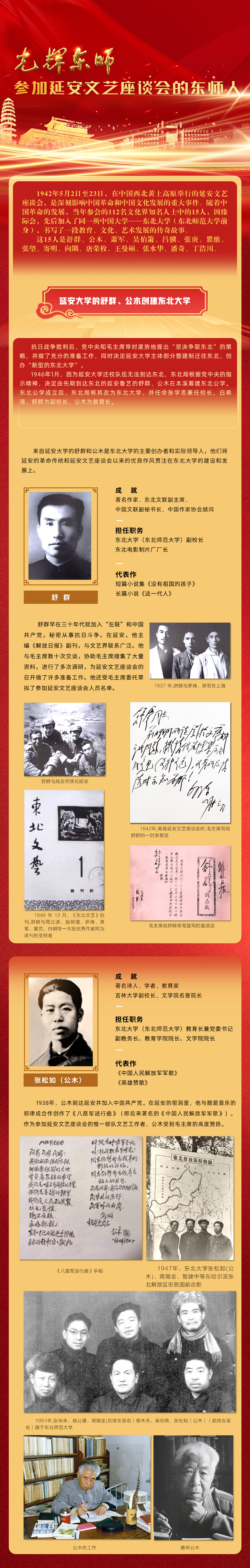 近期,党委宣传部又推出了这部“光辉东师”系列之《参加延安文艺座谈会的东师人》纪录片,通过影像追忆了15位东师早期创建者在延安、东北及新中国建设期间的革命经历、艺术创作和开展文化教育事业等的情况。