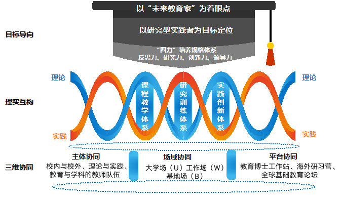 多次召开专题调研会、学术研讨会和专家论证会,明晰了教育博士培养的“研究型实践者”目标定位,建构了反思力(对自身教育实践与理论进行批判性审视)、研究力(敏锐洞察、科学分析和有效解决教育问题)、创新力(开放包容、主动进取、稳健推进教育变革)、领导力(勇担社会责任、引领变革方向、感染影响他人)为核心的培养规格。依此构建教育博士培养体系。