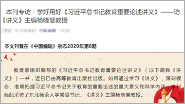 关于学习运用好《习近平总书记教育重要论述讲义》的通知 《中国编辑》杂志专访 《习近平总书记教育重要论述讲义》主编杨晓慧教授