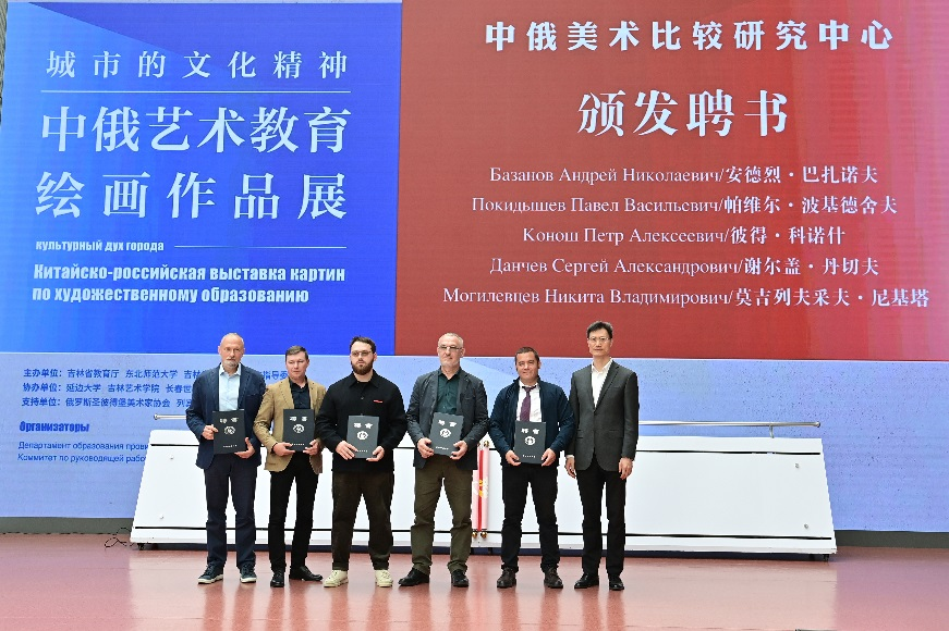 俄罗斯艺术科学院通讯院士、俄罗斯国家美协副主席、圣彼得堡美协主席安德烈·巴赞诺夫,圣彼得堡艺术科学院通讯院士、圣彼得堡美协副主席、列宾美术学院夏季学校负责人格里申·亚历山大教授,俄罗斯圣彼得堡美协副主席、列宁格勒州美协主席彼得·阔纳什等六位俄罗斯专家;以及吉林省教育厅党组书记、厅长张洪彬,副厅长刘学军;吉林省文联副主席孙凤平;我校校长徐海阳,党委常委严蔚刚,吉林省文艺界、兄弟院校和学校机关部处的相关领导同仁等出席了展览开幕式。