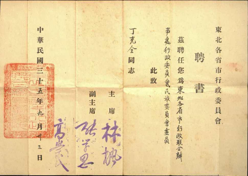 东北各省市行政委员会聘书
