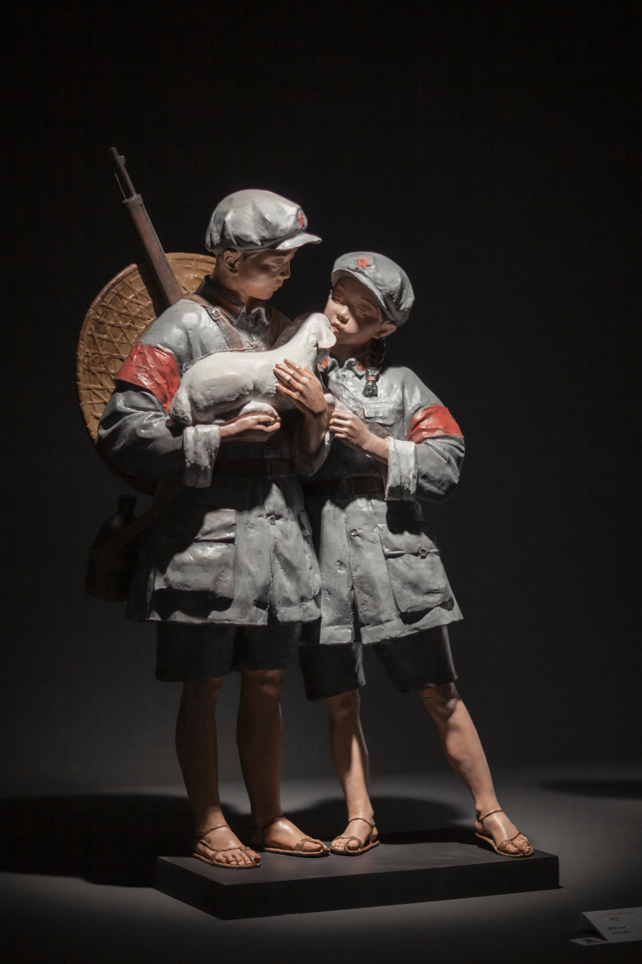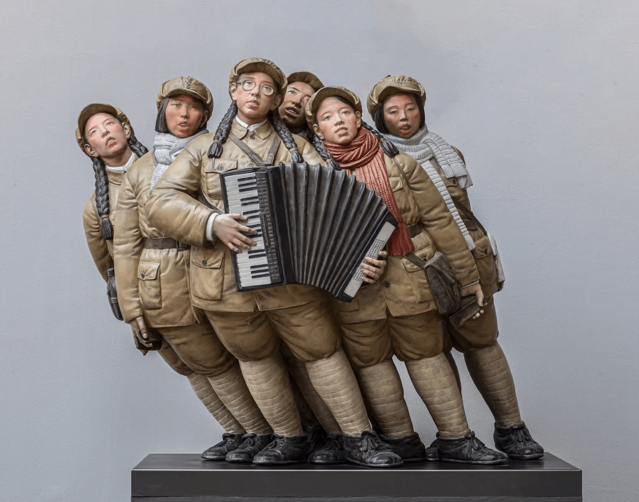 雕塑作品《同唱》塑造了解放战争时期第四野战军文工团女兵群像。该作品力图展现中国女兵身上震慑心灵的艺术张力,将人性的高尚、勇毅、坚定、无畏等情绪融入历史洪流,在战争烈焰中淬炼出坚定毅力与超然气魄,如同一幅壮丽的精神图景。作品通过简洁、和谐、统一的形式感,朴素无华、扎实沉稳、含蓄内敛的塑造语言以及丰富生动的细节刻画,共同呈现其精神内核。