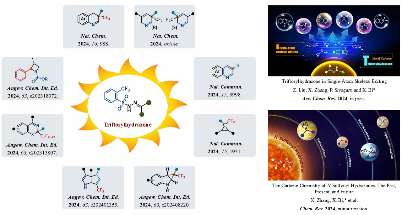 近日,化学学院毕锡和教授领导的卡宾化学团队在有机分子单原子骨架编辑领域取得了系列研究进展。围绕“邻三氟甲基苯磺酰腙(Triftosylhydrazone)”卡宾化学开展了系统研究工作,2024年在《自然·化学》(Nature Chemistry)等化学领域顶级期刊上发表论文十余篇,推动了这一前沿领域的发展。